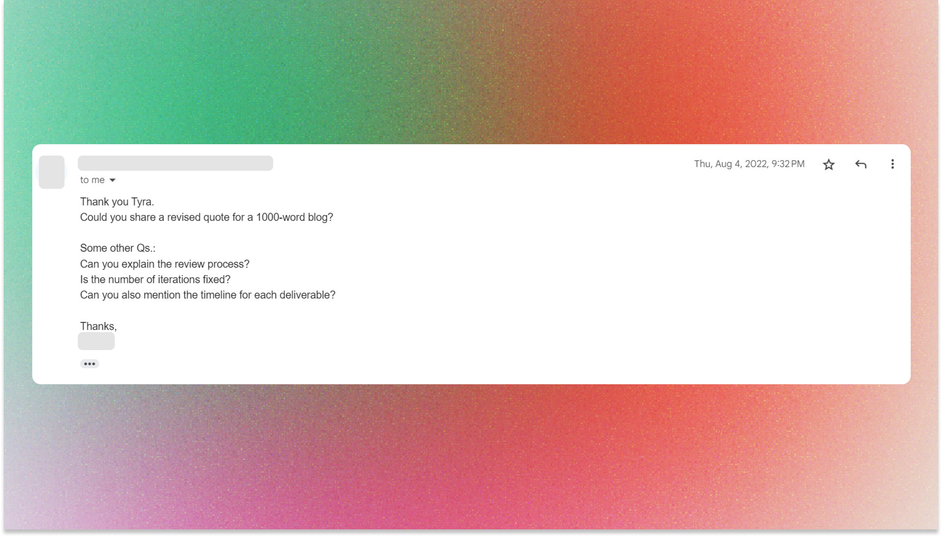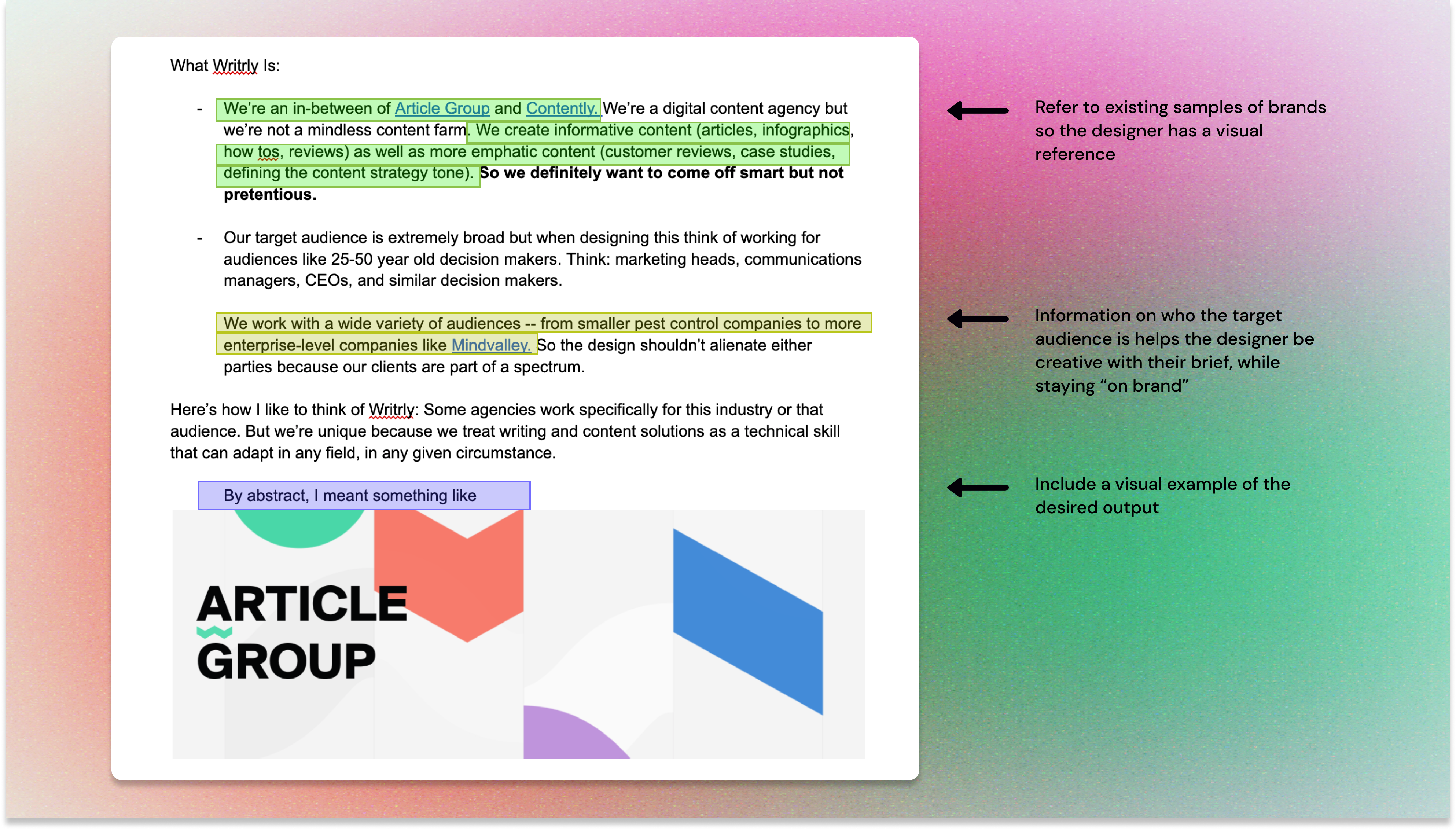 Why: This narrows down their scope of options and ensures that the final output is more or less aligned with what you’re looking for. This information upfront saves a lot of revision time in the future.