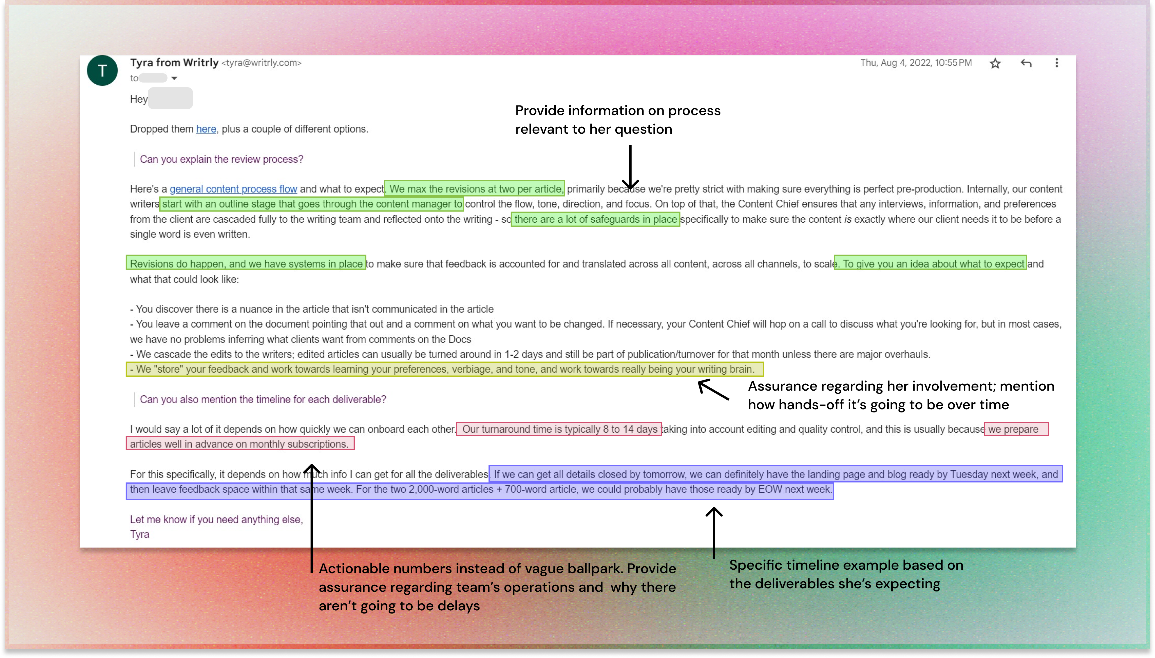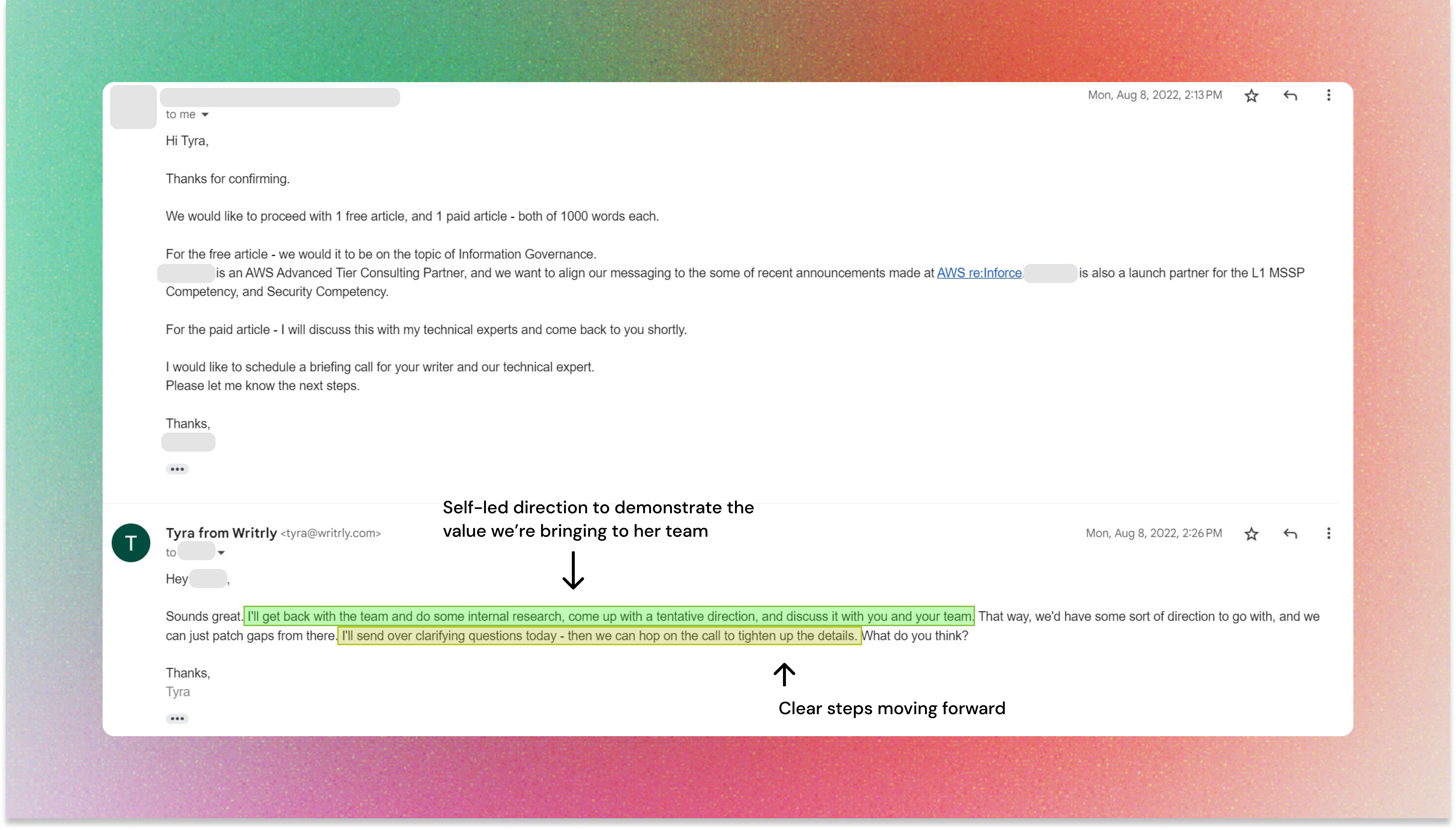 My time at Writrly was split between coordinating with the internal team, and doing outbound sales. I connected with director of/marketing VPs, founders, and SMB owners who didn’t have their own content team.
