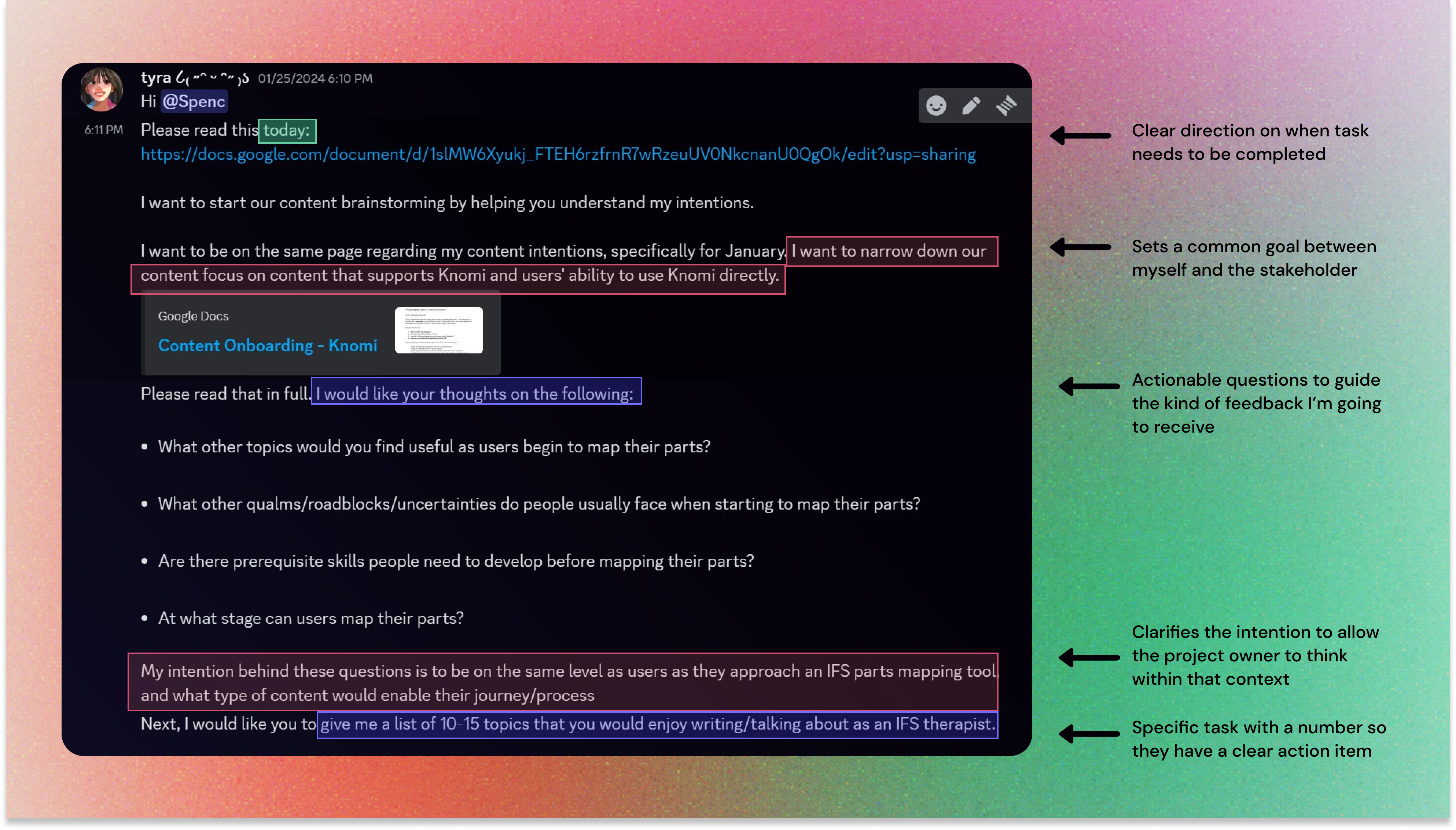 Why: This reduces scope creep and narrows down their focus on what you think is important as an individual contributor. It’s not uncommon for project owners to want to be involved in every single aspect of the project. Having too many voices in a project isn’t always helpful and typically ends in delays or an unfocused strategy.