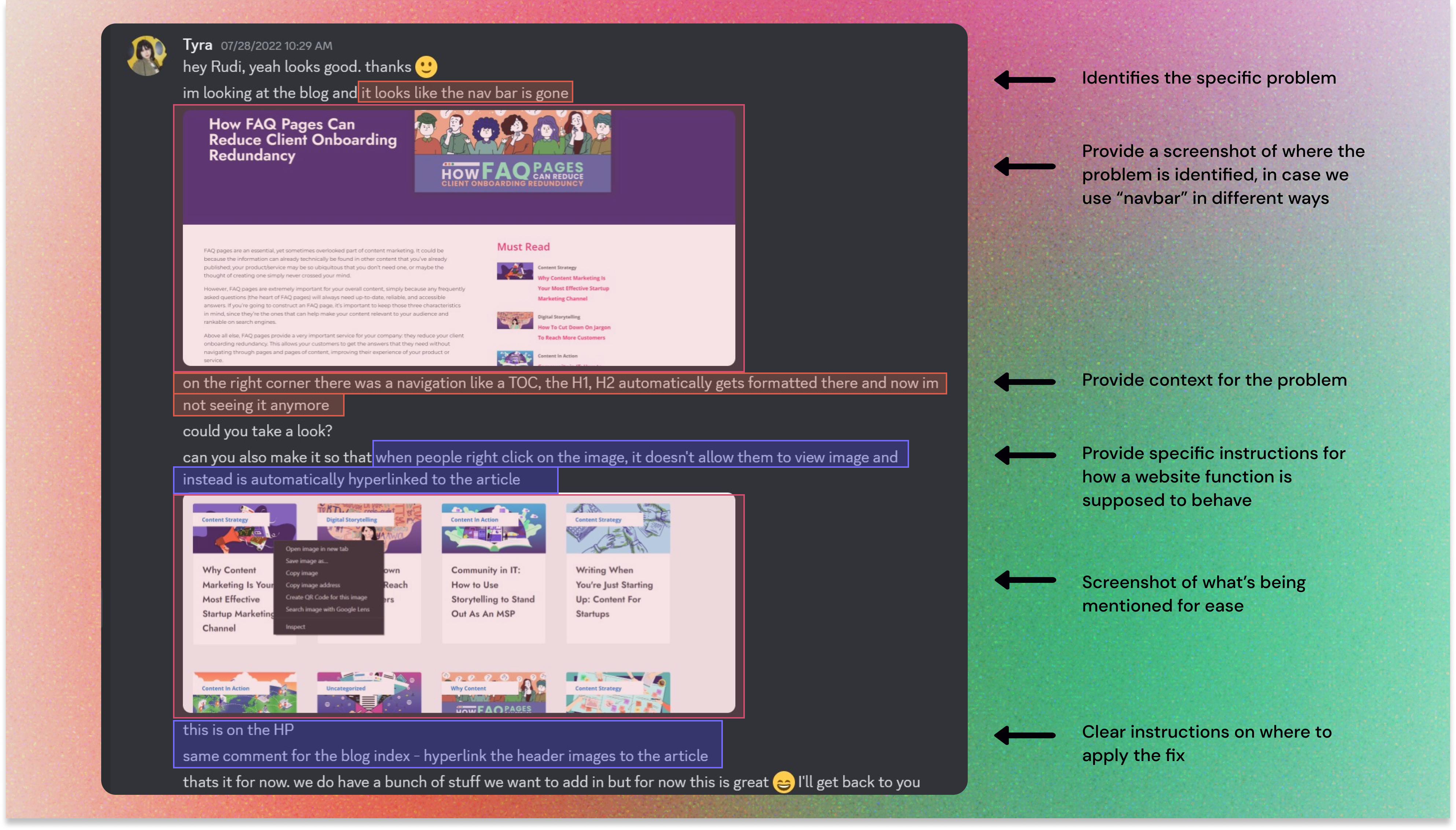 Why: I find this is especially true when working with developers - I could have a completely different understanding of a technical jargon or term than they do. Provide screenshots and screen recordings to eliminate miscommunication.