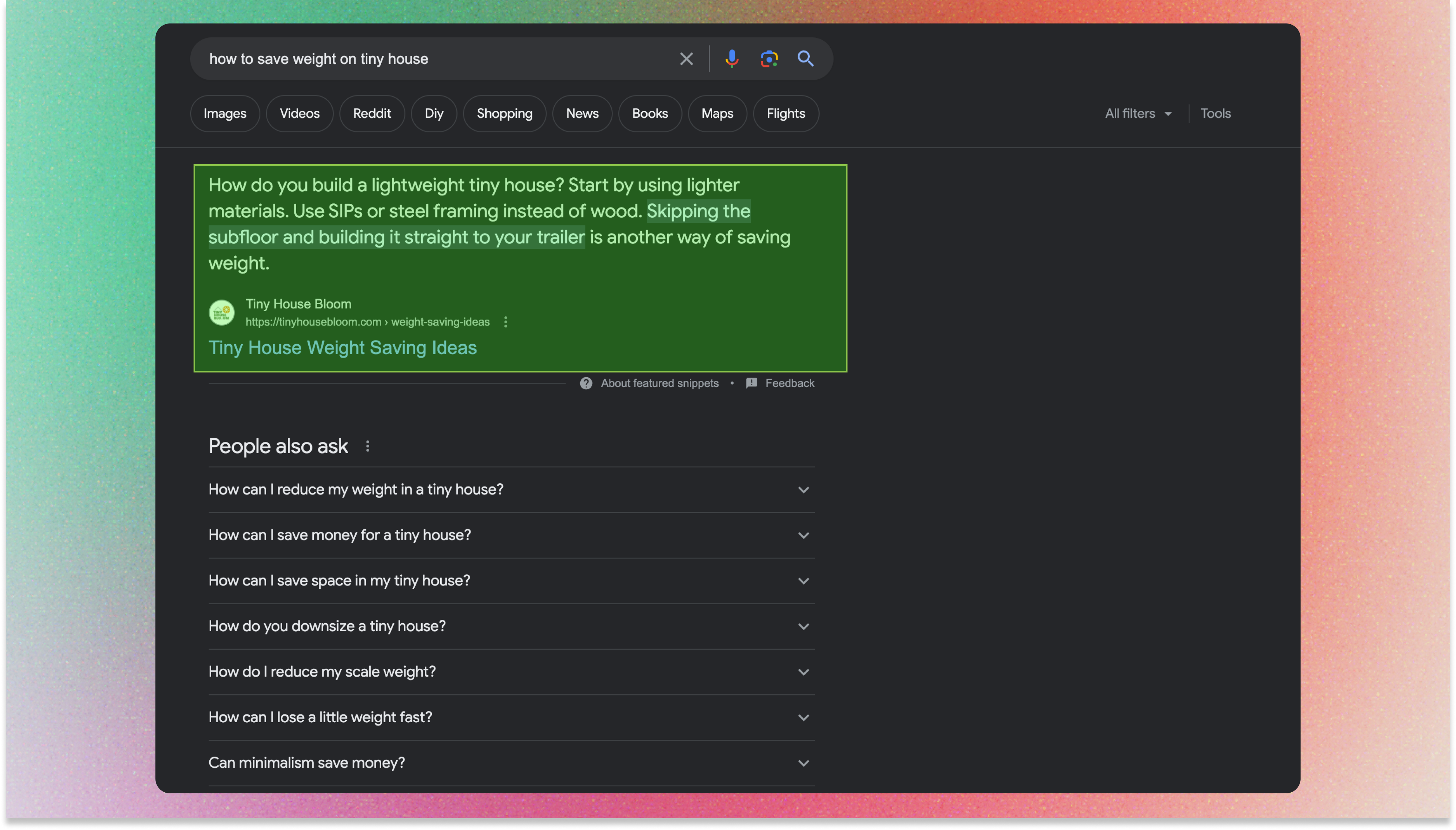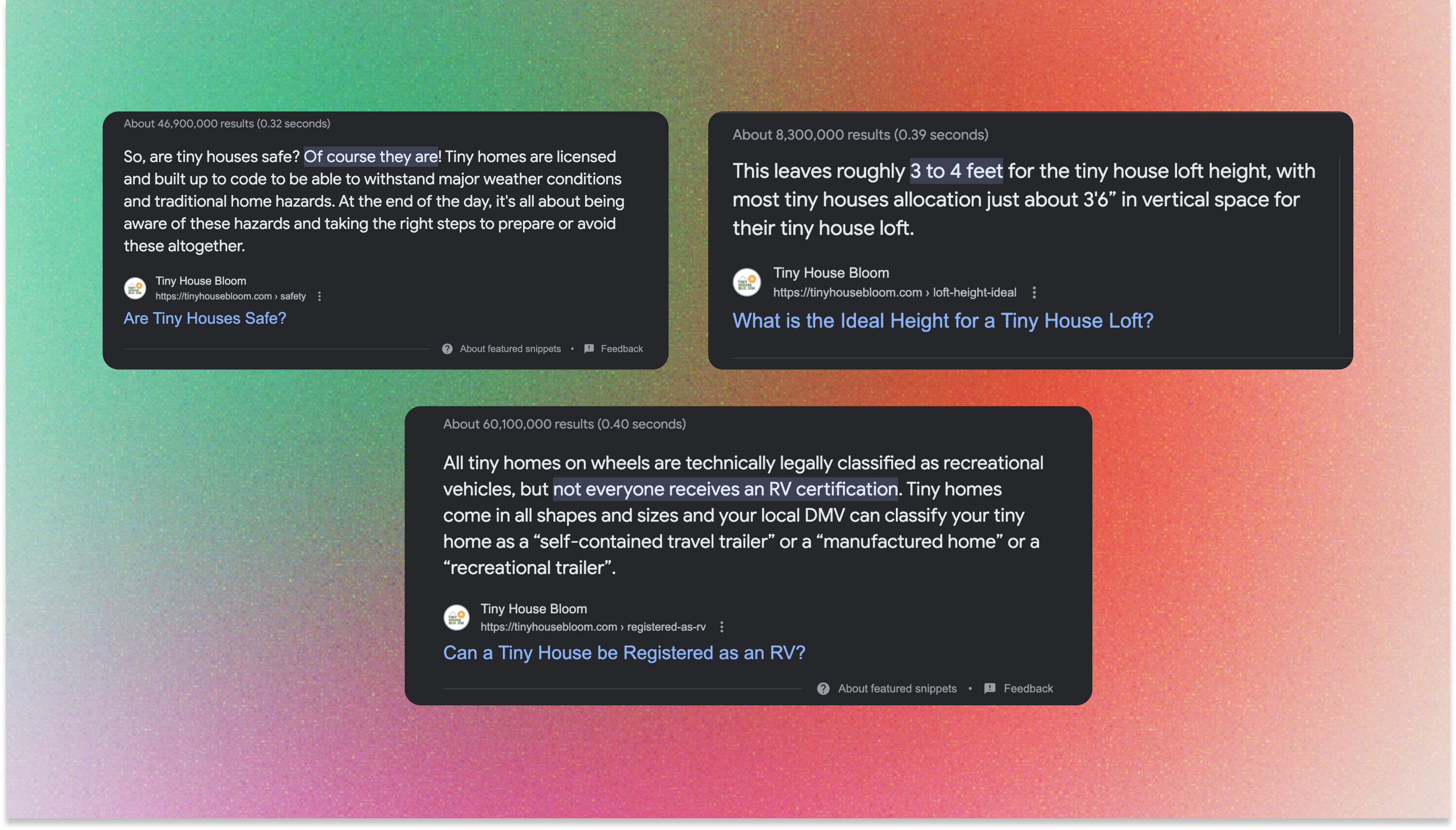Majority of the featured snippets in this category come from instructional Youtube videos or the blogs of tiny house owners who are sharing their personal journeys. It’s competitive because: