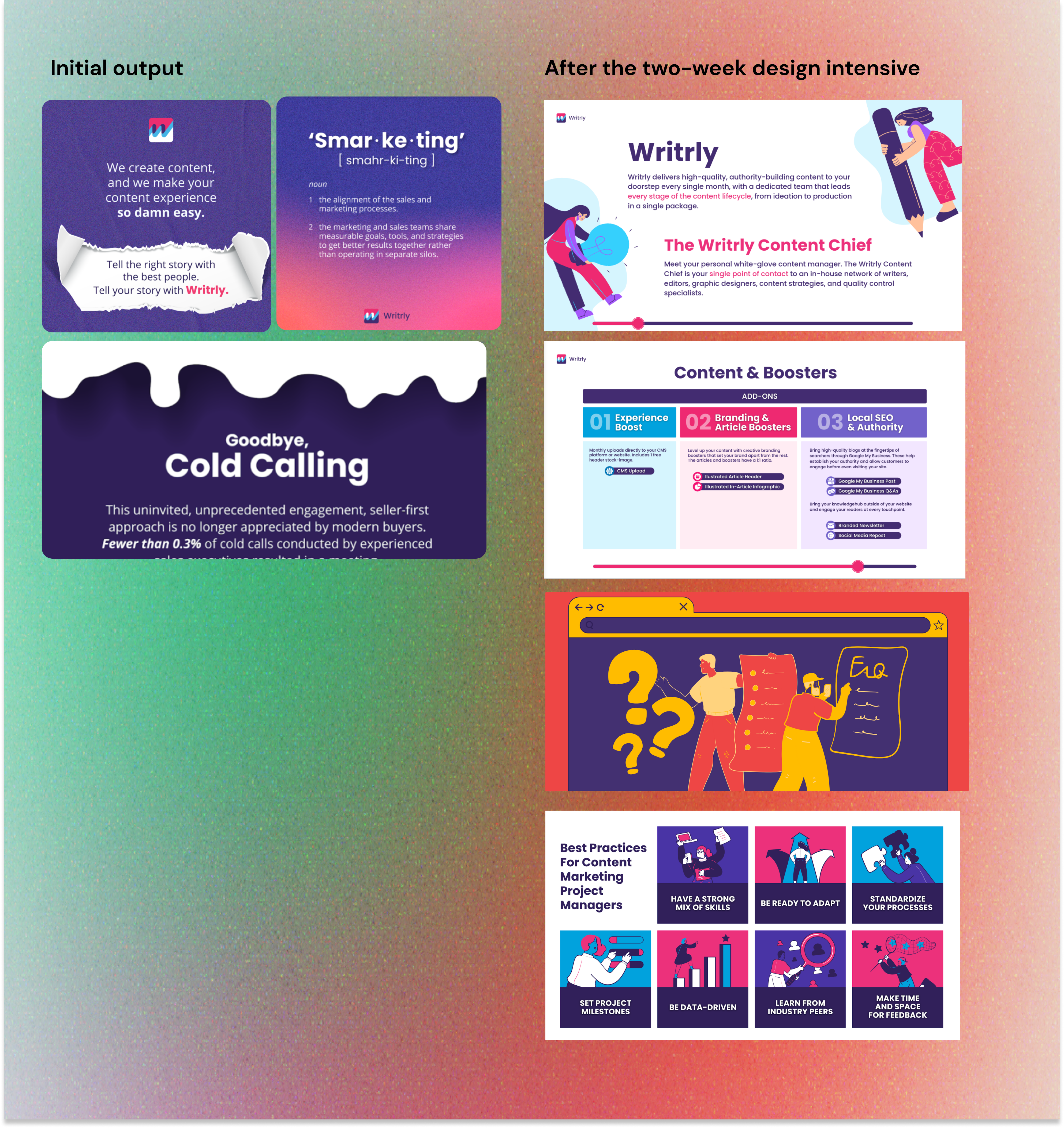 - By week four she was independently creating assets based on the brief, with little to no revisions necessary