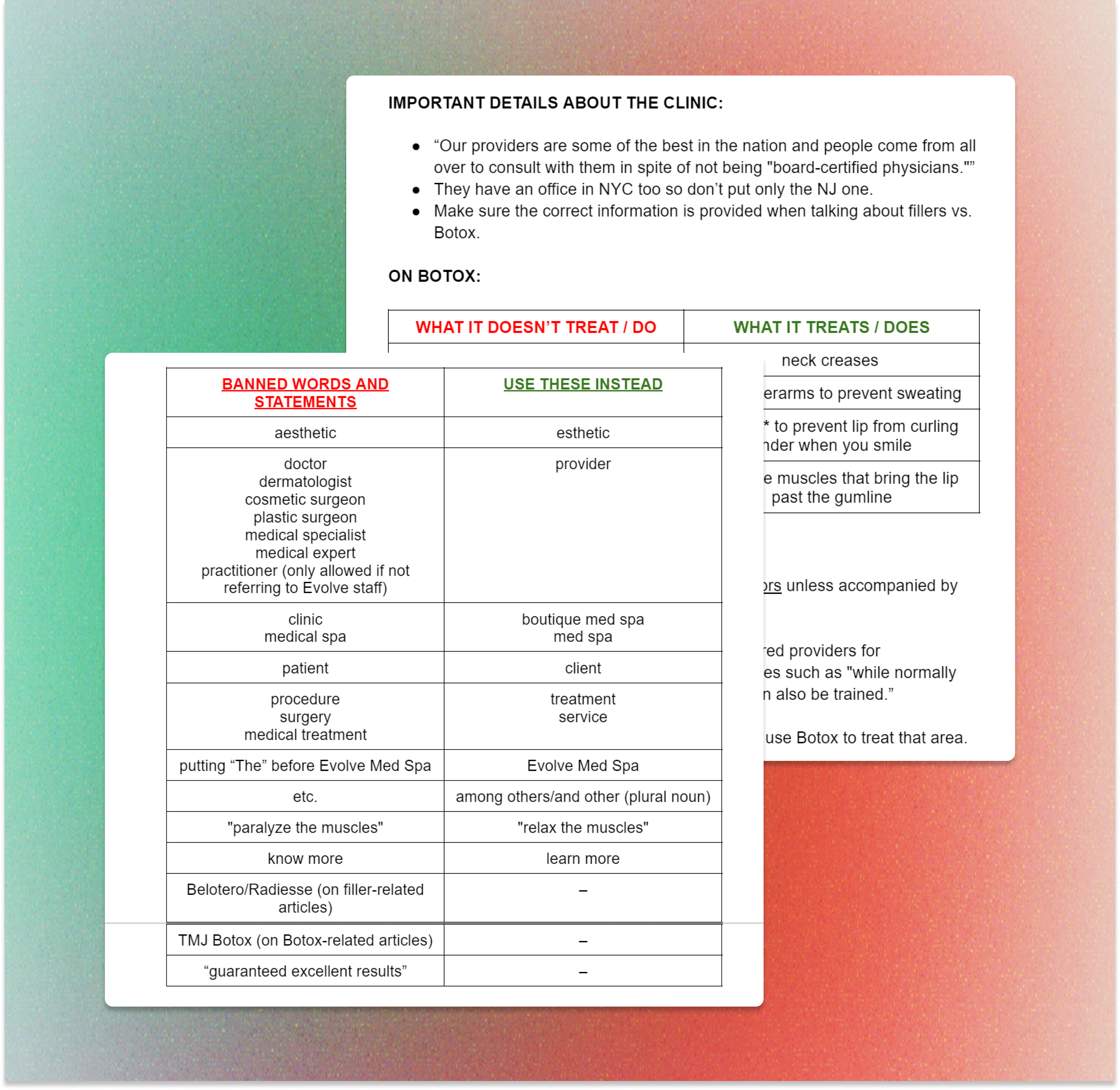 Next, my cofounder and I spent two weeks on documentation. We developed comprehensive style guides to serve as self-serve onboarding documents for writers.